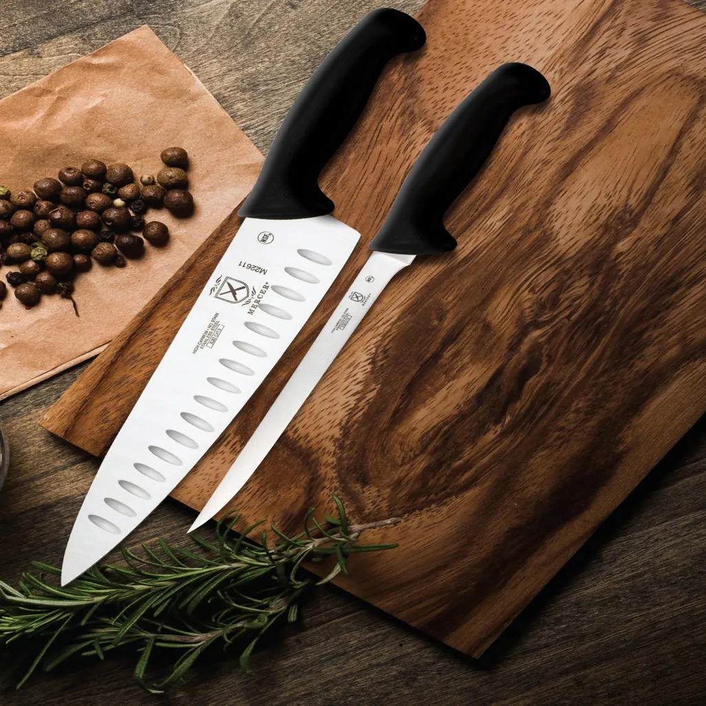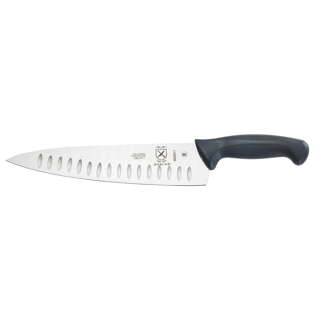 Sharp, durable, and comfortable to use, Mercer Millennia chef knives are some of the best tools for a commercial kitchen. These knives feature carbon steel blades with a durable edge that stays sharp as it slices, dices, cuts, minces, and more. The handle is made out of Santoprene and its non-slip grip gives your chef maximum control. They're all NSF Listed for easy cleaning and sanitation.