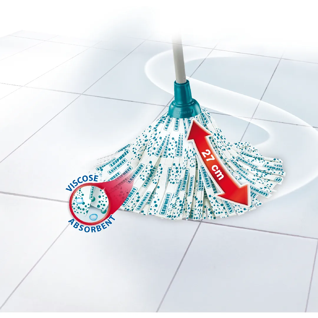 The Leifheit Classic Mop features absorbent viscose strips that quickly remove dirt and water, giving you more time for the finer things in life. For extra convenience, the mop is available in a set with a 12-litre bucket and wringer, allowing upright wringing without bending or touching dirty water. The flexible viscose strips make thorough cleaning easy, whether you’re wiping large areas in sweeping motions, navigating around furniture, or reaching tight corners. Wringing is effortless: simply twist the mop head into the wringer and press down the handle — the strips come out as dry as if hand-wrung.
