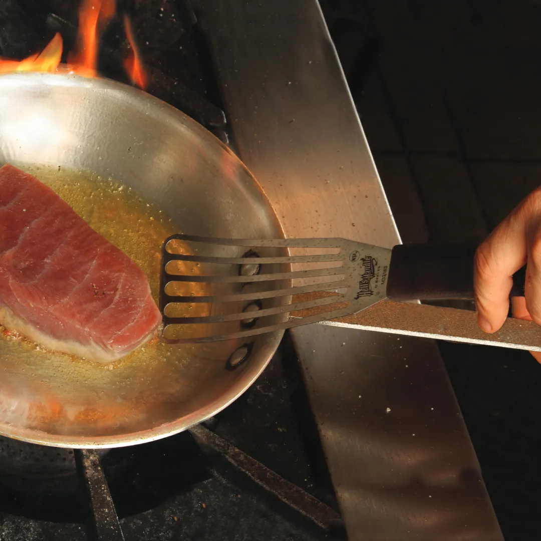 The precision-ground stainless steel blade provides the perfect combination of flexibility and stiffness. It is connected to the handle with a sanitary seal design. The innovative high heat-resistant handle absorbs 50% less heat, staying cool to the touch. It also features a dual-textured finish for extra grip and slip resistance.