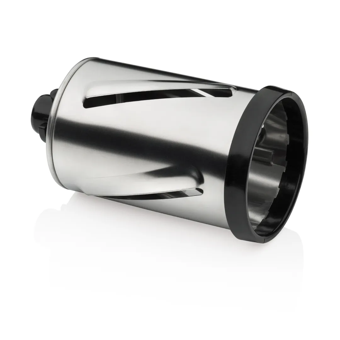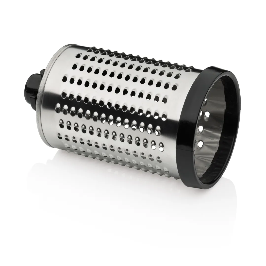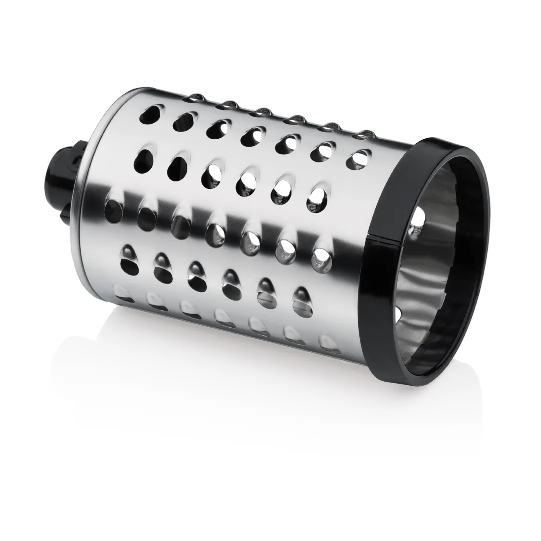 The high-quality Drum Grater is the all-purpose helper in every kitchen. The three drums offer the most varied possibilities for cooking or baking - coarsely grated chocolate, finely grated nuts, and finely sliced cucumber. The useful suction foot provides a safe hold, while the angled construction makes for easy removal of food. A pestle is included for safe working with smaller pieces. The drums are dishwasher safe.