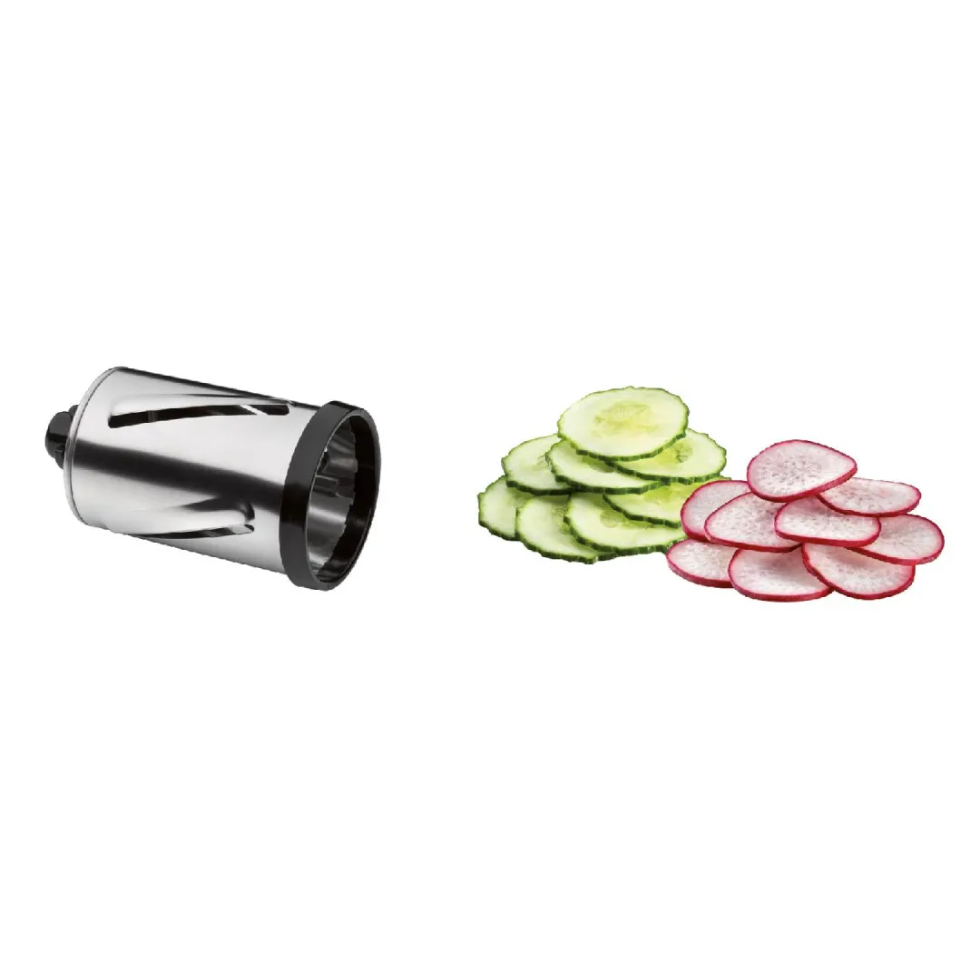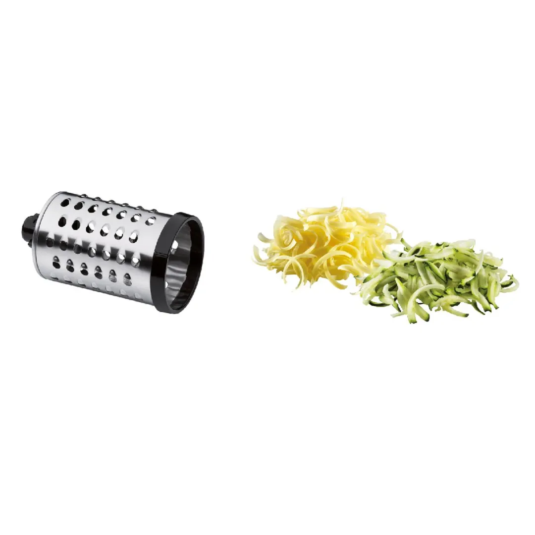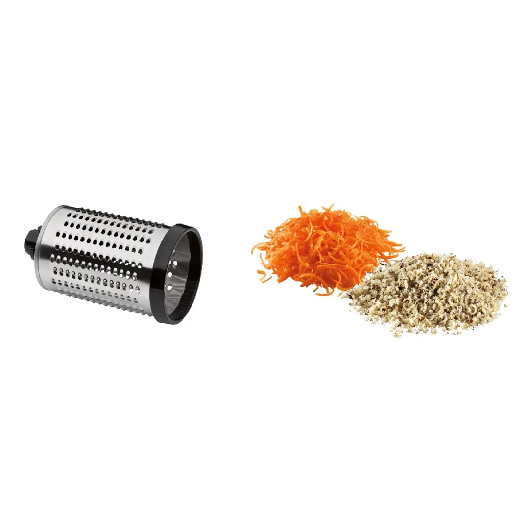 The high-quality Drum Grater is the all-purpose helper in every kitchen. The three drums offer the most varied possibilities for cooking or baking - coarsely grated chocolate, finely grated nuts, and finely sliced cucumber. The useful suction foot provides a safe hold, while the angled construction makes for easy removal of food. A pestle is included for safe working with smaller pieces. The drums are dishwasher safe.