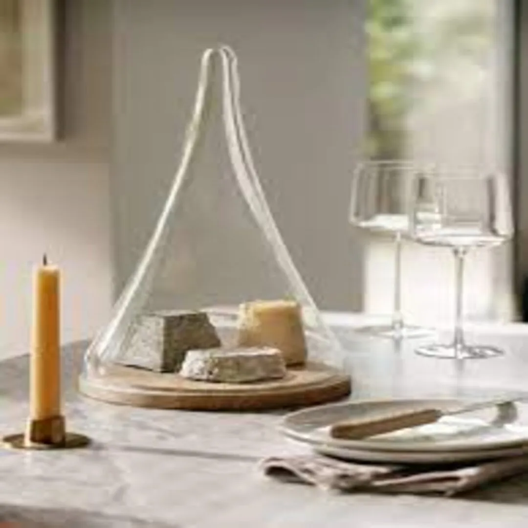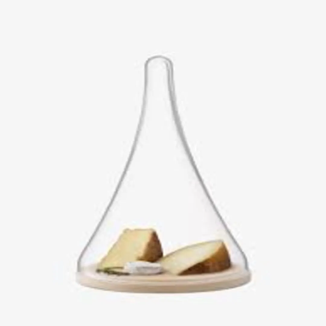 A tall conical mouth-blown dome with hollow handle located on a wooden base, inspired by the distinctive profile of a tagine dish. The stepped wooden base is shaped from natural FSC-certified oak. For serving cheese, cake or pastries.