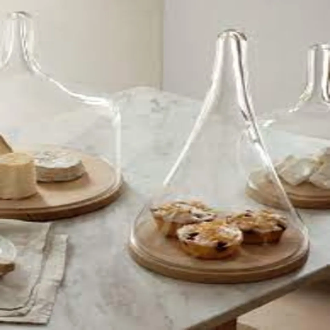 CLOCHE. Mouth-blown glass domes for serving and presenting. The long, tapered handles and distinct shapes are reminiscent of the unique contours seen in traditional tagine dishes.