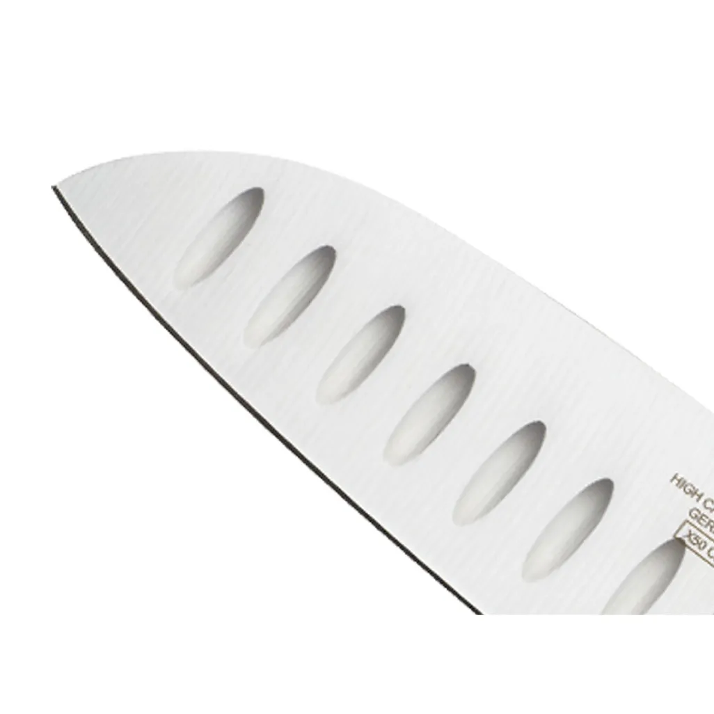 An Eastern-style chef's knife, the Genesis 18cm santoku slices with power and minces with precision. Rectangular in shape, it features a series of ground shallows called a Granton edge to create tiny air pockets, allowing thin slices to release easily from the blade.