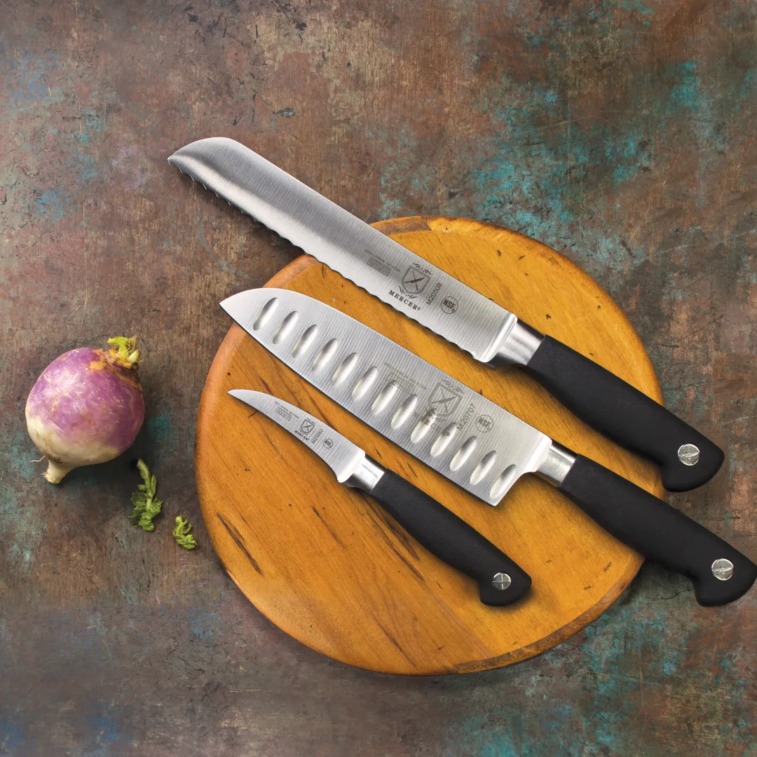 Mercer Cutlery offers the Genesis Collection of kitchen knives to provide professional quality to the home chef. Comfortable, durable, and efficient, Genesis knives feature fully forged, single-piece blades made from high-carbon, no-stain German steel. Their taper-grind edges are polished by hand, and their substantial bolsters provide helpful balance. Black nonslip Santoprene handles make Genesis knives comfortable and secure in the grip, improving efficiency and safety in the kitchen.