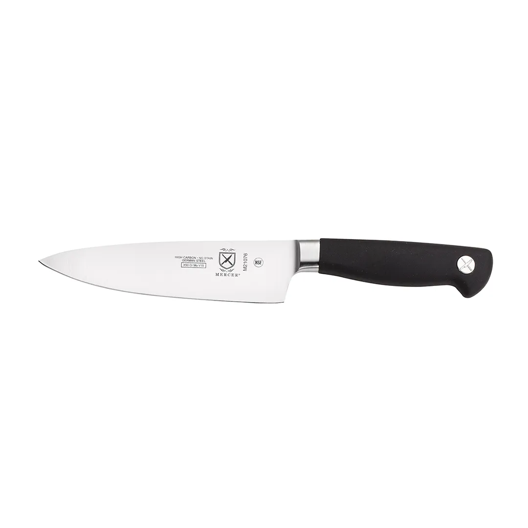 Mercer Cutlery offers the Genesis Collection of kitchen knives to provide professional quality to the home chef. Comfortable, durable, and efficient, Genesis knives feature fully forged, single-piece blades made from high-carbon, no-stain German steel. Their taper-grind edges are polished by hand, and their substantial bolsters provide helpful balance. Black nonslip Santoprene handles make Genesis knives comfortable and secure in the grip, improving efficiency and safety in the kitchen.