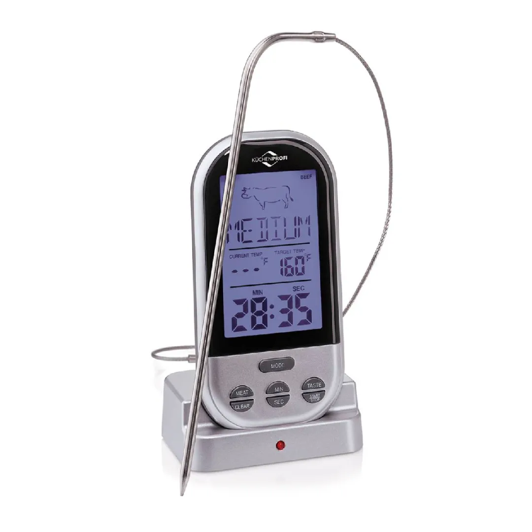 With the Kuechenprofi digital cooking thermometer, you no longer have to wait in the kitchen to see when the meat is ready while your guests are having fun. The device has a range of up to 30 metres so that you can carry it around while enjoying a glass of wine. The thermometer will let you know with a beep when the desired temperature has been reached!