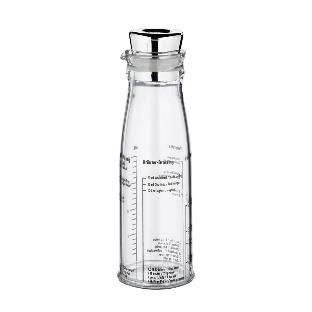 Thanks to the clear measuring scale on the transparent bottle, it is easy to use. The shaker is made from high-quality plastics with a stainless-steel lid that has a silicone seal and has a capacity of 250ml. It comes with 4 different salad dressing recipes on the bottle and is dishwasher safe.