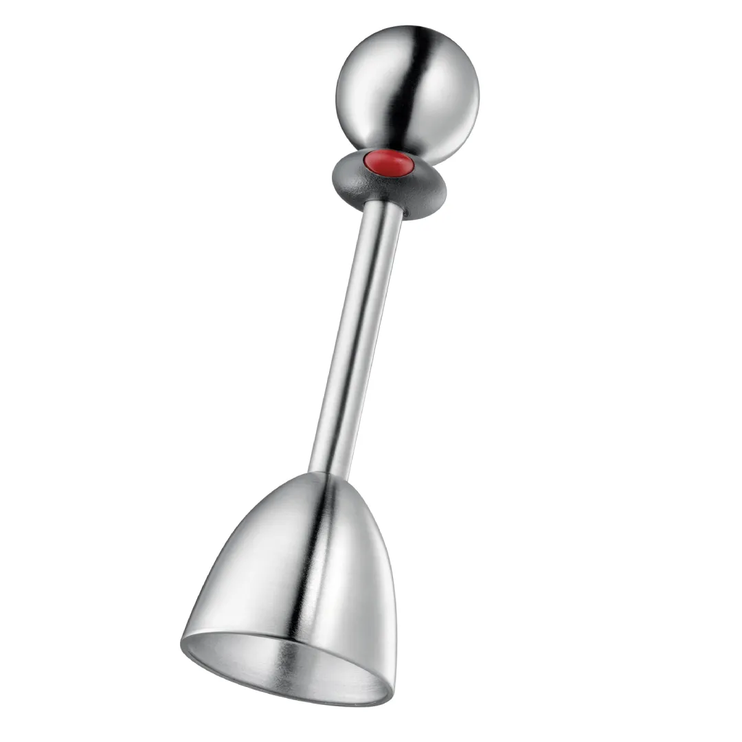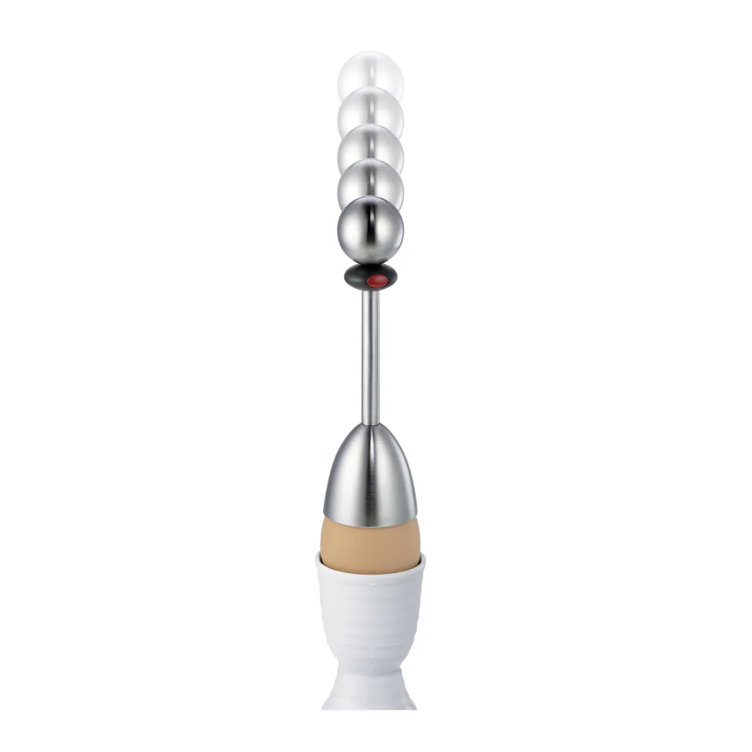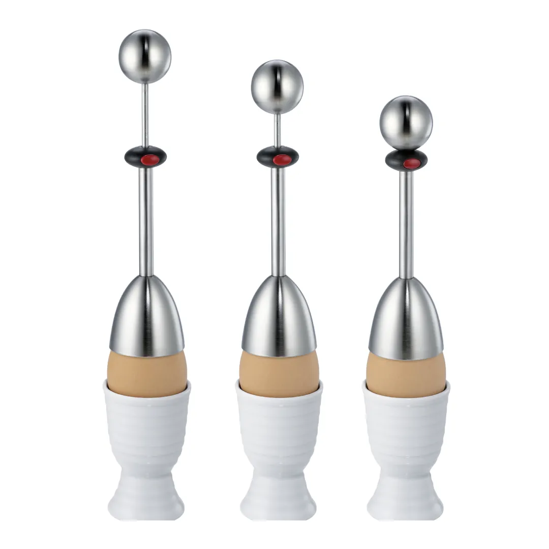 Protect fingers from sharp shell peels while quickly and efficiently topping boiled eggs. To use, pull the ball upwards until it locks, place the egg cracker on the egg, hold below the black ring and press the push button. Lift the cap above the breakpoint, and the egg is ready to enjoy.