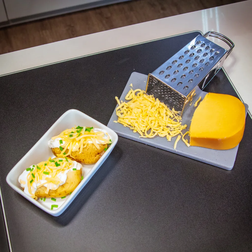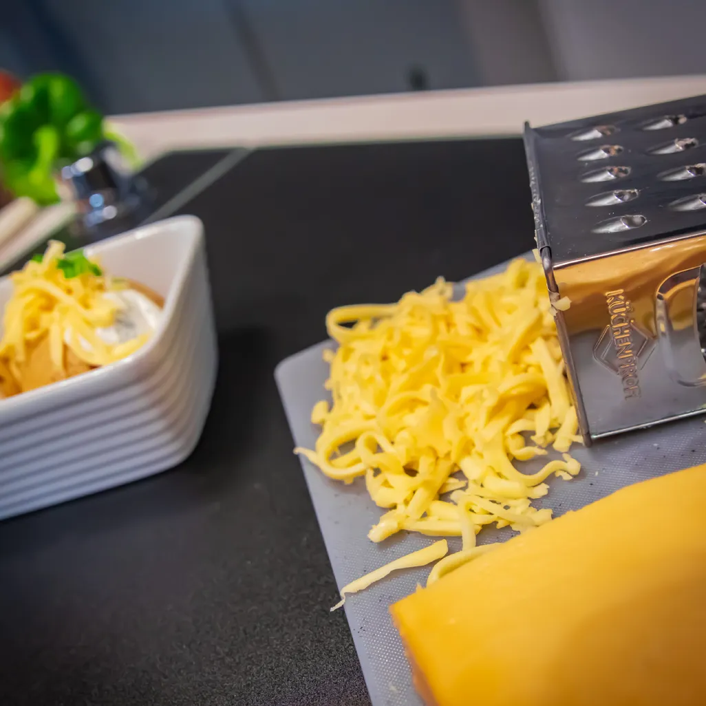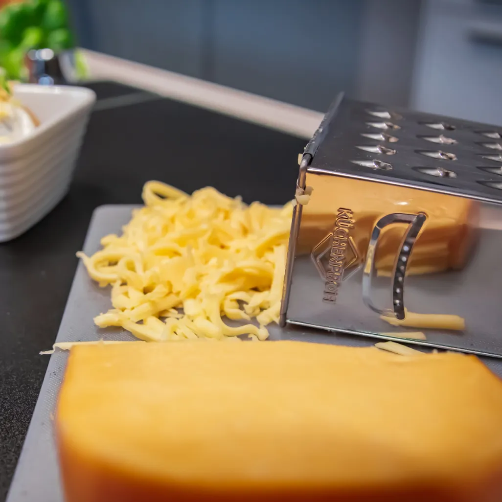 The Jumbo Grater has different grating textures on each of its 4 sides: - Rough grater e.g., for grating cheese - Fine grater e.g., for grating chocolate flakes - Etched grater which can be used like a zester - Slicing holes for cucumbers