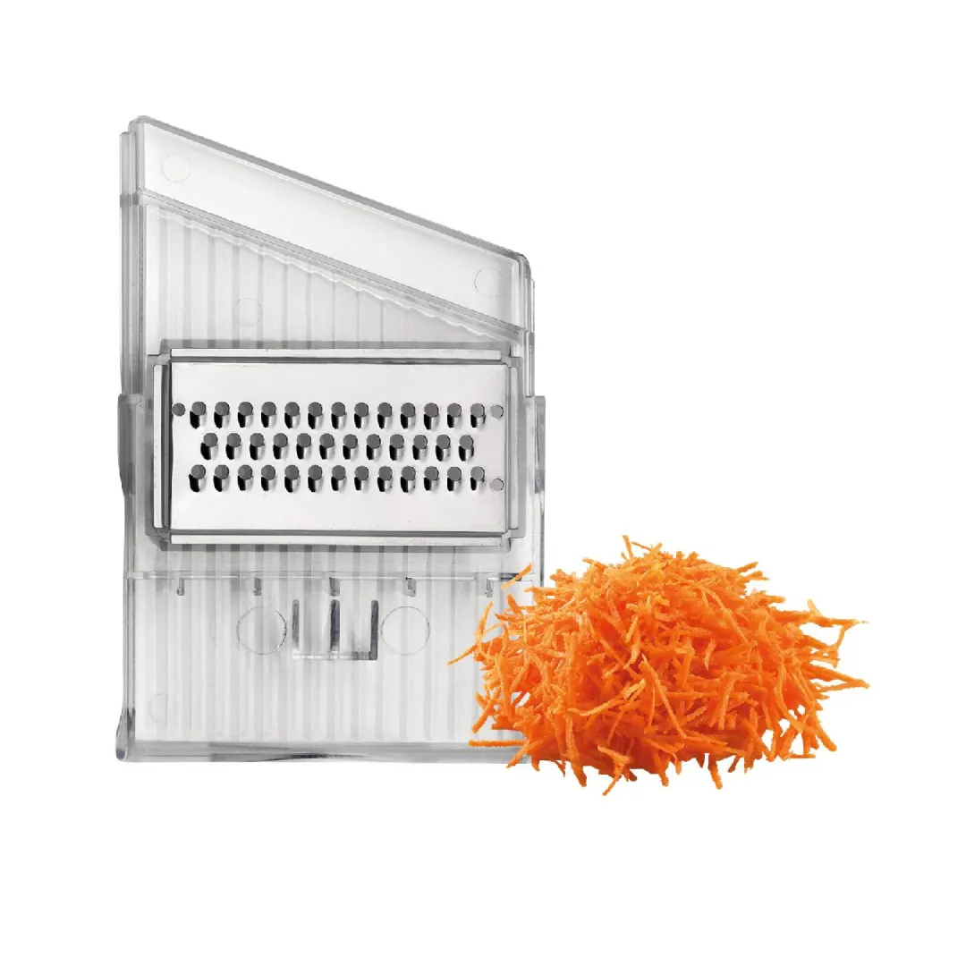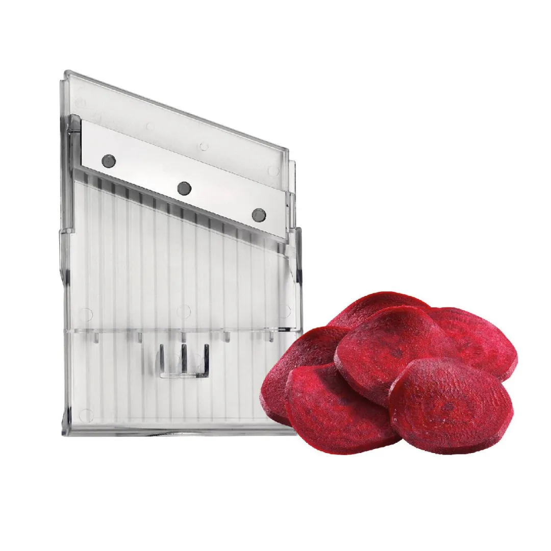 Vegetables and fruit can be turned into even slices or julienne in an instant. The slicer comes with 4 different blade inserts for slices, grating, and julienne strips. The slicing thickness can easily be adjusted. It has a comfortable handle and a non-slip foot. Smaller foods should always be placed in the food holder as the stainless-steel blades are very sharp. The blades should be rinsed by hand, but all other components are dishwasher safe.