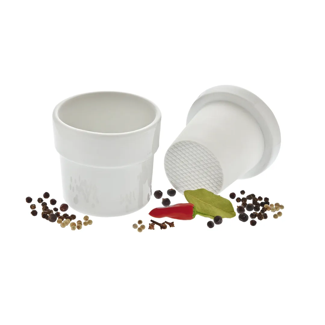 With the Kuechenprofi spice grinder, you have pepper, garlic, clove, ginger and many other flavour carriers quickly at hand. The fluted bottom of the grater crushes fresh and dried herbs and spices in the desired degree of grinding from coarse to fine. The porcelain grater does not take on any odours and is easy to clean. The vessel is also ideal for storing a supply of your favourite spice protected from light.