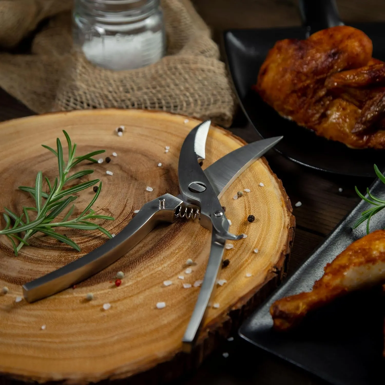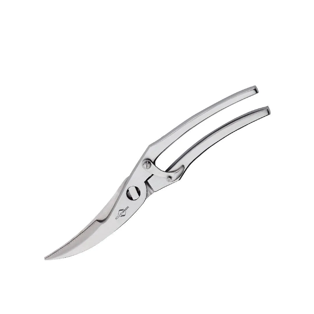 The Kuechenprofi Poultry Scissors allows easy cutting of chicken bones. The contoured grips are ergonomically designed for right- or left-handed use. The spring-loaded blades are curved and serrated and can cut away cartilage without damaging the meat. The scissors also have a safety lock for safe storage.