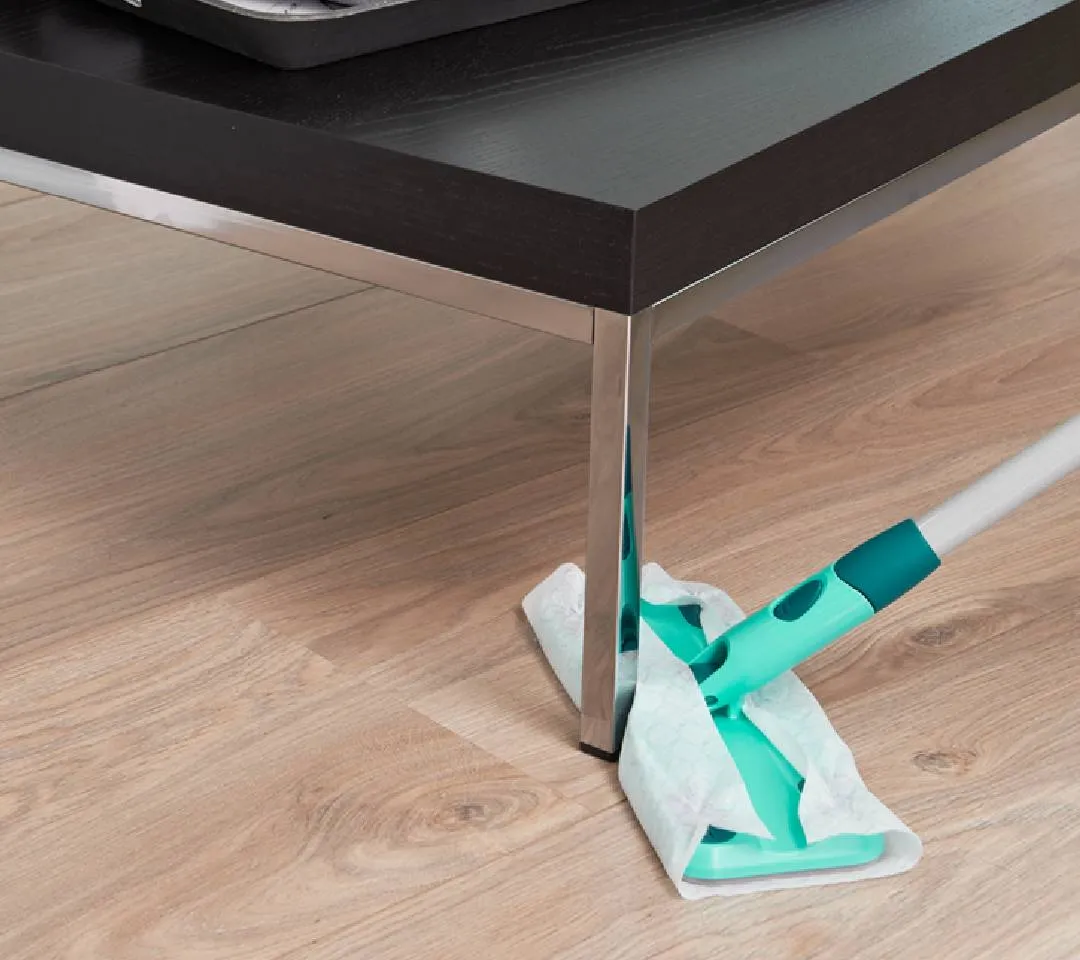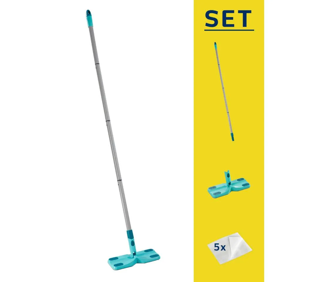 The Leifheit Click System Clean & Away Set is the perfect solution for quick and effortless in-between cleaning. Designed for convenience, it includes a four-piece handle, a Clean & Away baseplate, and five dust cloths—ready to use right out of the box. The cloth fibers when rubbed on the floor become fibres become electro-statically charged and eventually attract dust, dirt, and hair like a magnet, unlike traditional brooms that scatter particles. With its 360° swivel joint and flat-folding design, the wiper easily glides under cupboards, sofas, and other hard-to-reach areas. A clever central opening in the baseplate ensures effortless cleaning around table and chair legs, while the hanging eyelet allows compact storage.