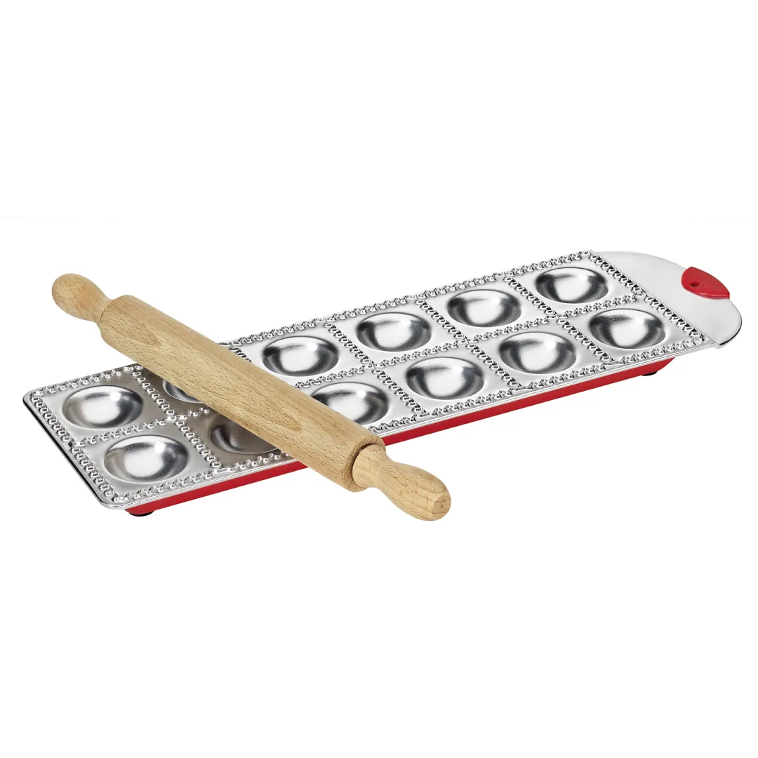 SKU: 0802903012Aluminium Ravioli Tray with non-slip rubber feet. 12 compartment trays with a wooden roller. read more ↓ read less ↑