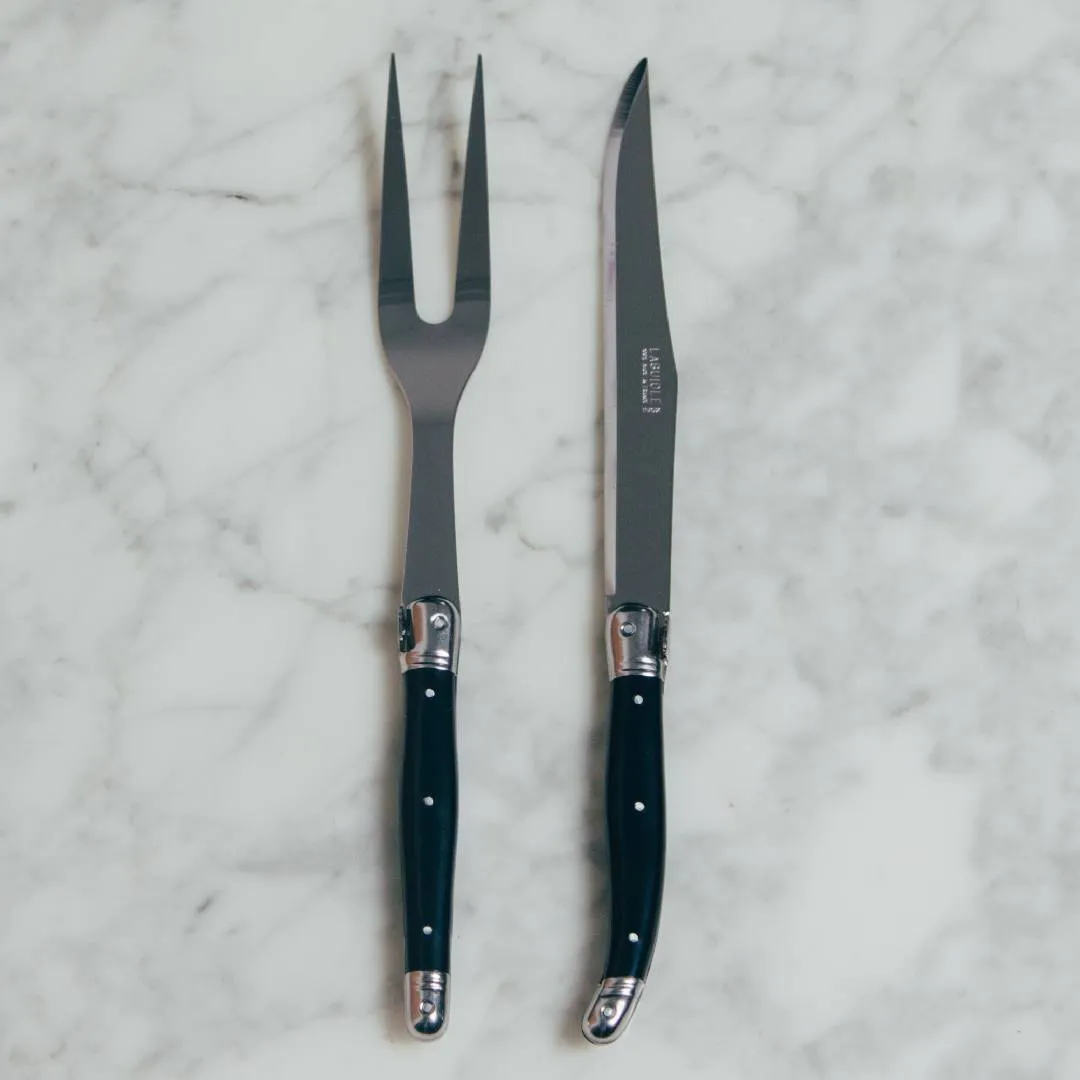 SKU: 77772LNCDLaguiole Carving set with full tang stainless steel riveted to ABS handle, in wooden tray. Made in France. read more ↓ read less ↑