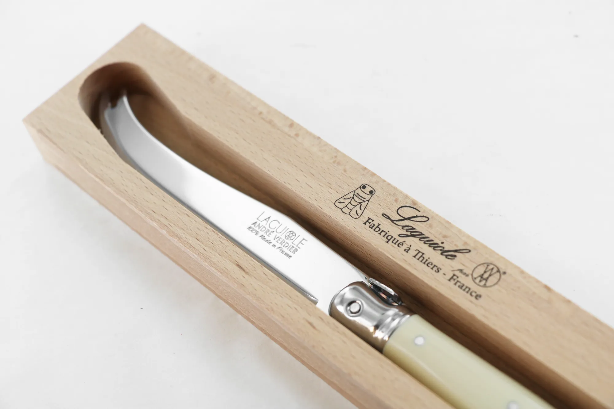The AndreVerdier Laguiole Cheese Knife looks lovely on any cheese board or platter. The handle has the traditional trademark bee logo and is riveted onto the full tang blade as with all AndreVerdier knives. The blade has a mirror finish and is made from hardened stainless steel.