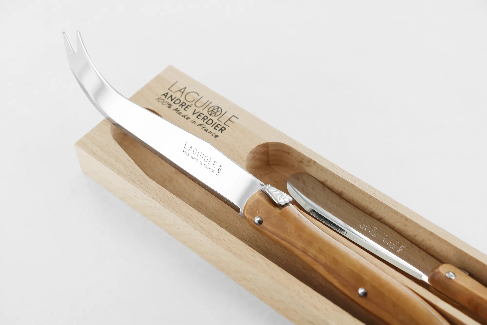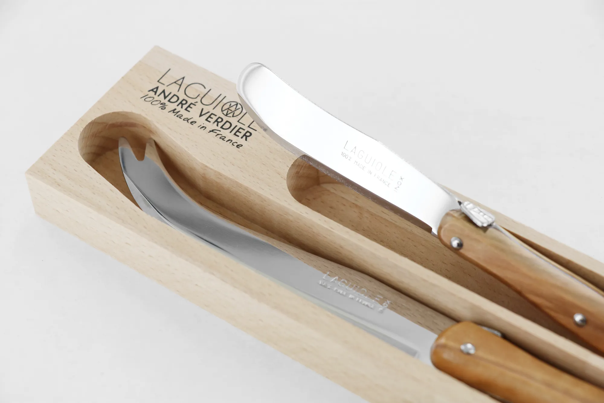 - The AndreVerdier Laguiole knives and utensils are made with a full tang and riveted olive wood handle
