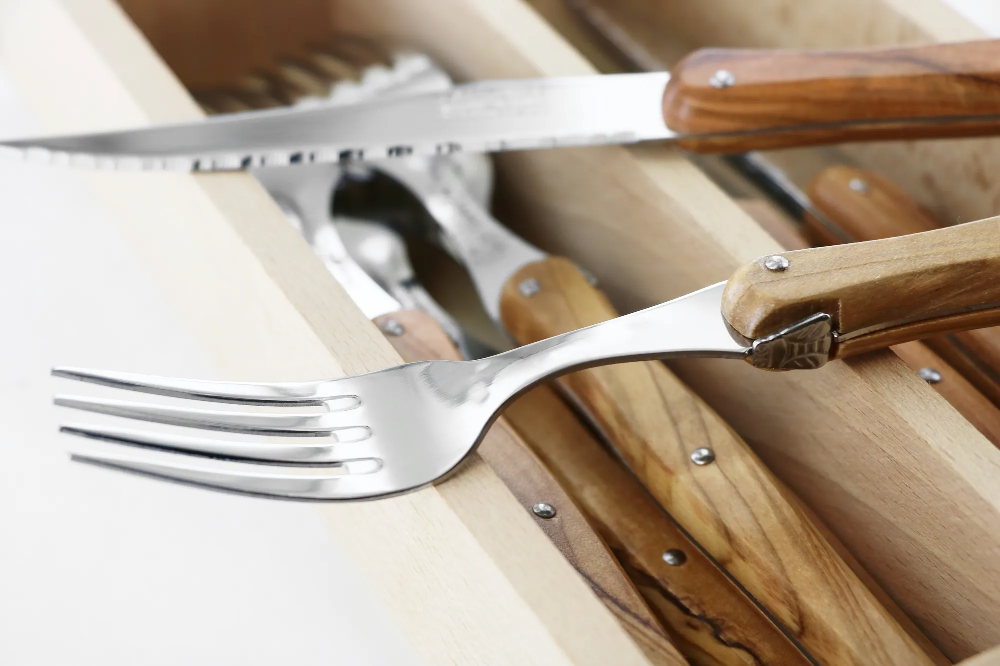 The AndreVerdier Laguiole 12 Piece Olive Wood Cutlery Set, with the trademark bee logo on the handle, has a beautiful mirror finish. Each knife has a micro-serrated stainless steel blade and every piece has a stainless steel cap on the olive wood handle. Presented in an open wooden box, this set is a classy wedding gift and will look stylish and elegant on any dinner table.