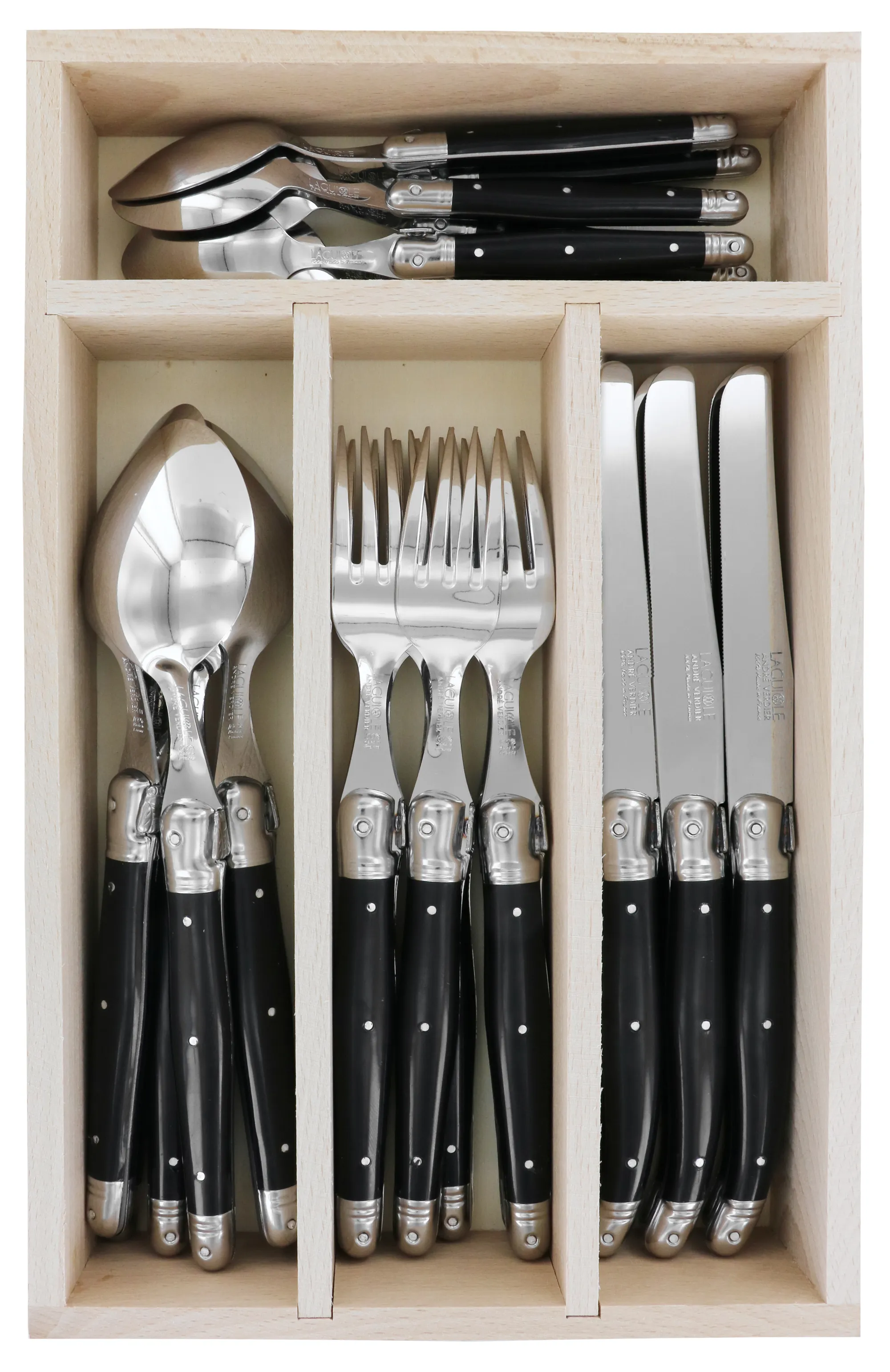 The Andre Verdier Laguiole 24 Piece Cutlery Set includes 6 dinner knives, 6 table forks, 6 table spoons and 6 tea spoons. Designed and manufactured by master cutlers in France, Andre Verdier is perfectly balanced and extremely durable, ensuring that this cutlery set will last. Tested and tried in many kitchens they cut smoothly and are razor sharp. Neatly presented in a wooden box that is made from beechwood for convenient storage in your cutlery drawer. The blades are made from high-quality stainless steel. is trademarked with a bee logo on the handle and completed with a beautiful mirror finish.