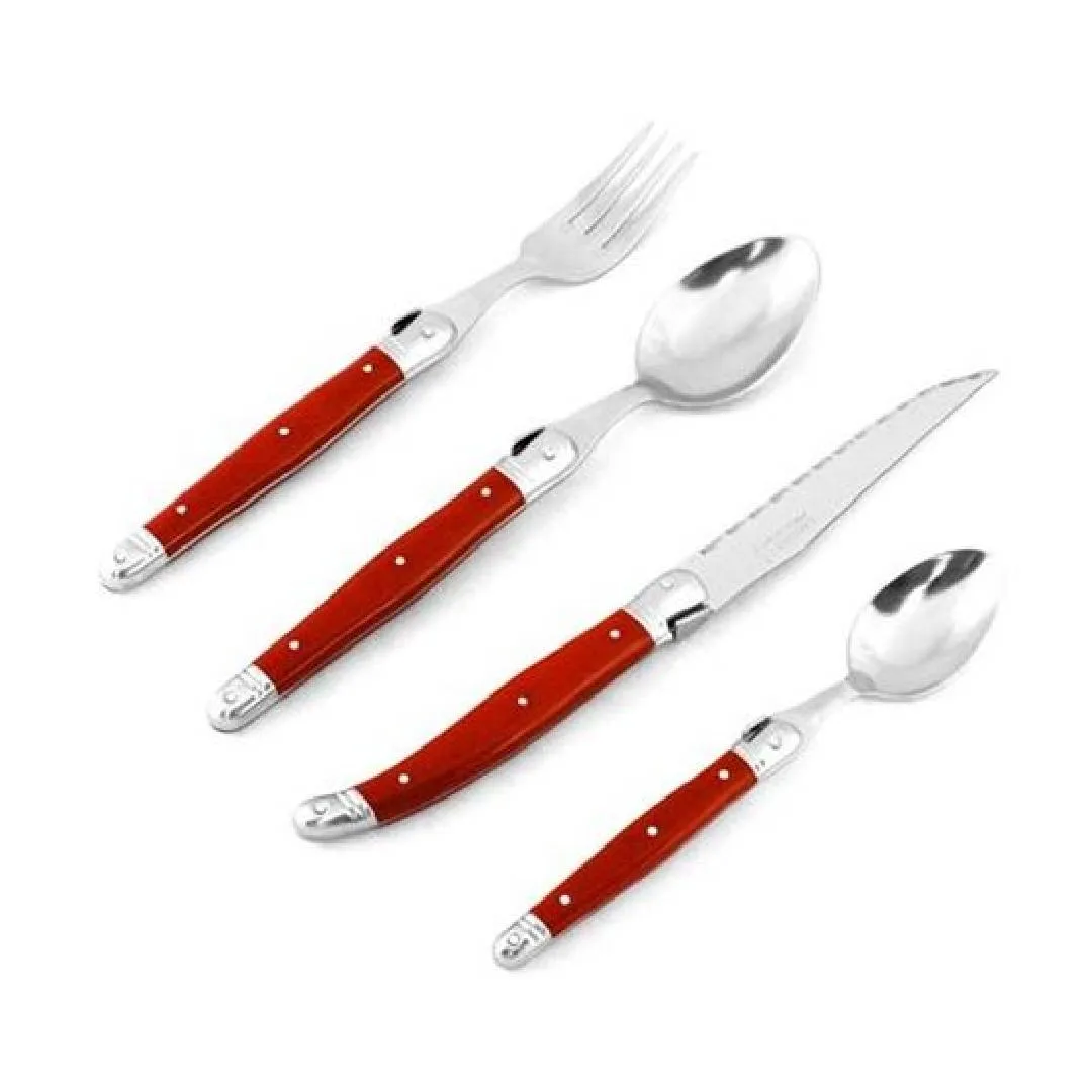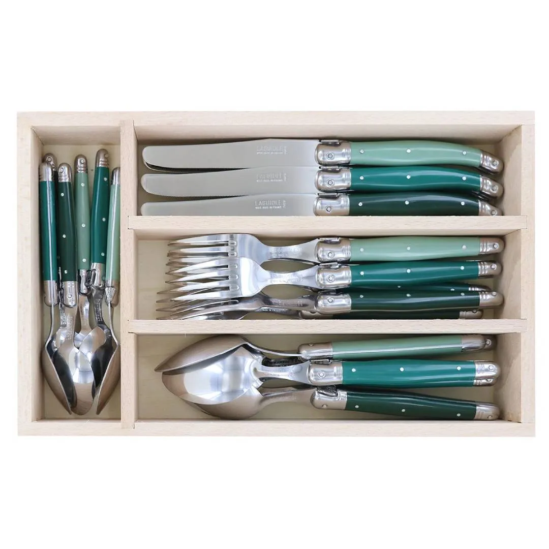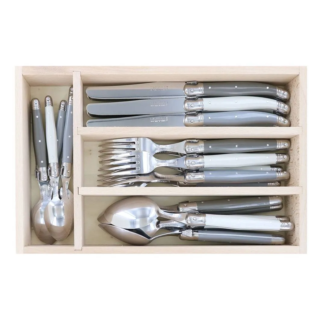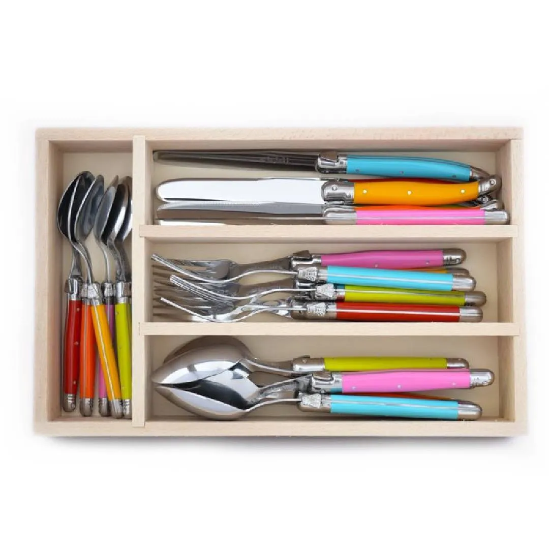 The Andre Verdier Laguiole 24 Piece Cutlery Set includes 6 knives, 6 table forks, 6 table spoons and 6 tea spoons. Designed and manufactured by master cutlers in France, Andre Verdier is perfectly balanced and extremely durable, ensuring that this cutlery set will last. Tested and tried in many kitchens they cut smoothly and are razor sharp. Neatly presented in a wooden box that is made from beechwood for convenient storage in your cutlery drawer. The blades are made from high-quality stainless steel. is trademarked with a bee logo on the handle and completed with a beautiful mirror finish.