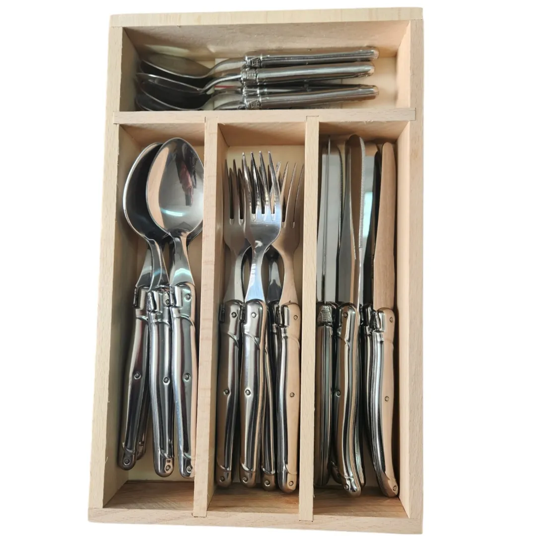 This 24-piece ensemble is thoughtfully curated to equip your dining table for most occasions. It is an ideal choice for establishing a new home or upgrading an existing collection with pieces that exude quality and sophistication. The cutlery set with wooden box is presented in a finely crafted beechwood storage box, designed to fit neatly into your cutlery drawer, keeping your treasured utensils protected and organised. Choosing Andre Verdier means opting for a legacy of excellence, a commitment to artisanal quality, and a promise of lasting beauty for your table. Embrace the tradition of fine French dining.