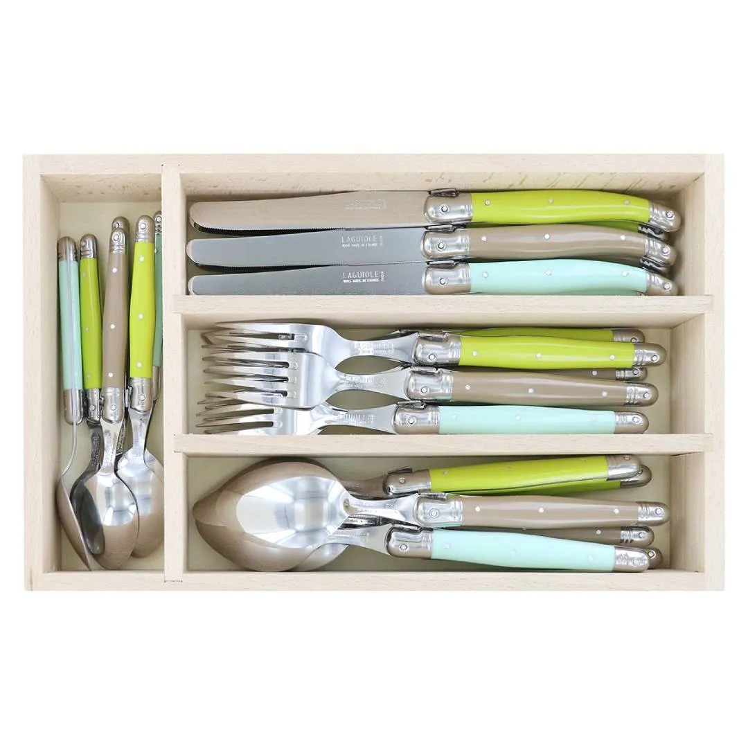 This 24-piece ensemble is thoughtfully curated to equip your dining table for most occasions. It is an ideal choice for establishing a new home or upgrading an existing collection with pieces that exude quality and sophistication. The cutlery set with wooden box is presented in a finely crafted beechwood storage box, designed to fit neatly into your cutlery drawer, keeping your treasured utensils protected and organised. Choosing Andre Verdier means opting for a legacy of excellence, a commitment to artisanal quality, and a promise of lasting beauty for your table. Embrace the tradition of fine French dining.