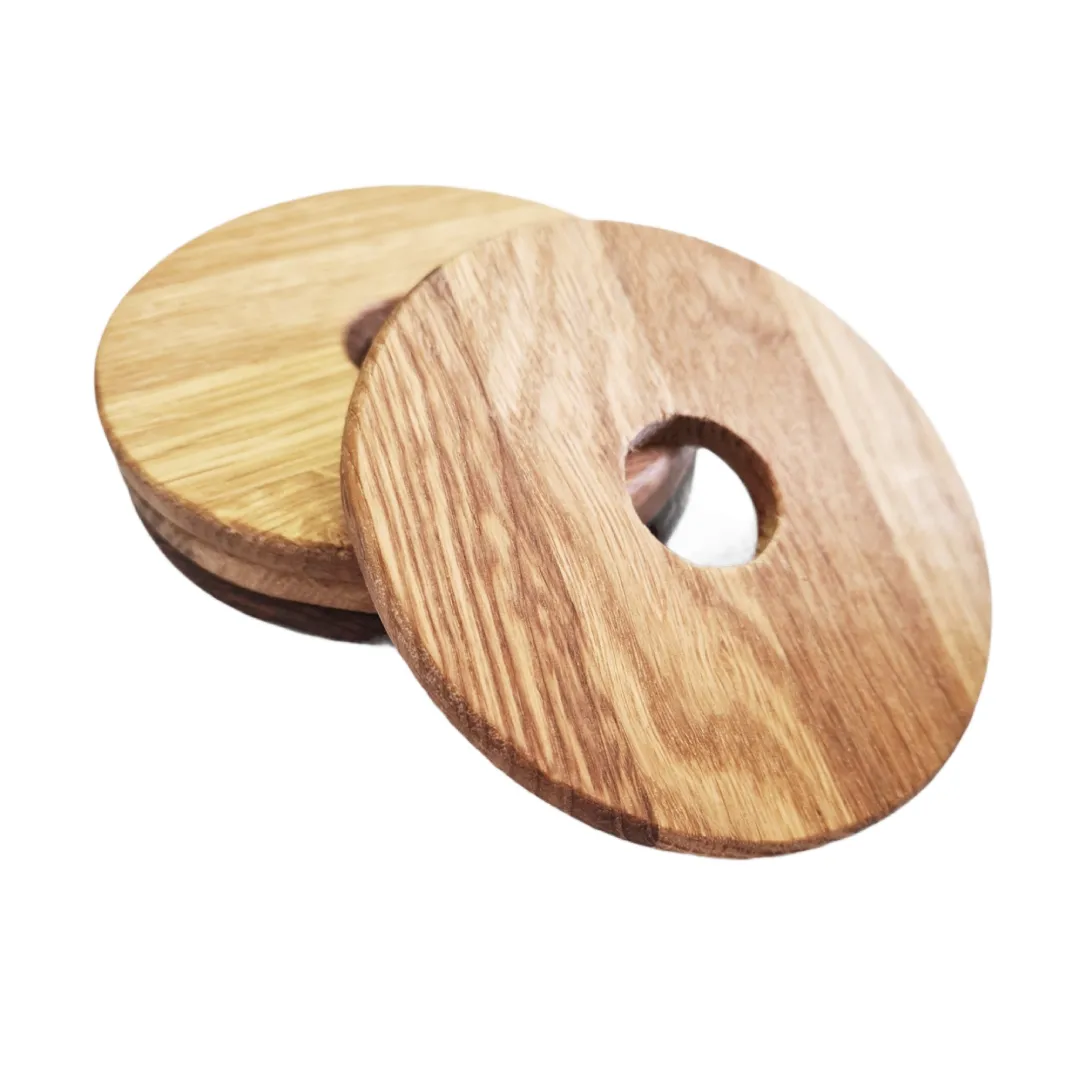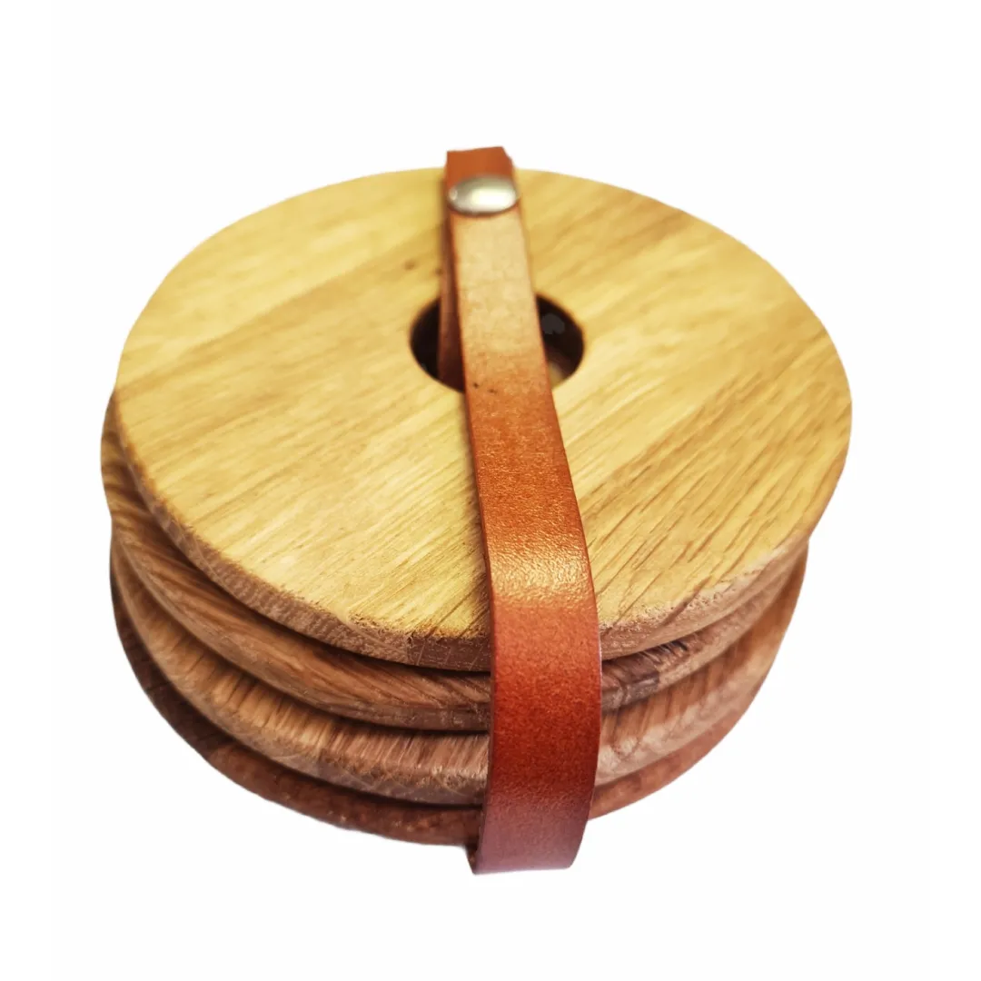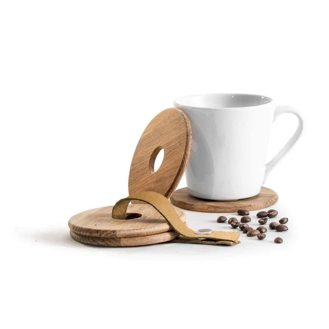 - Set of 4 oak coasters designed with a hole in the middle for easy storage