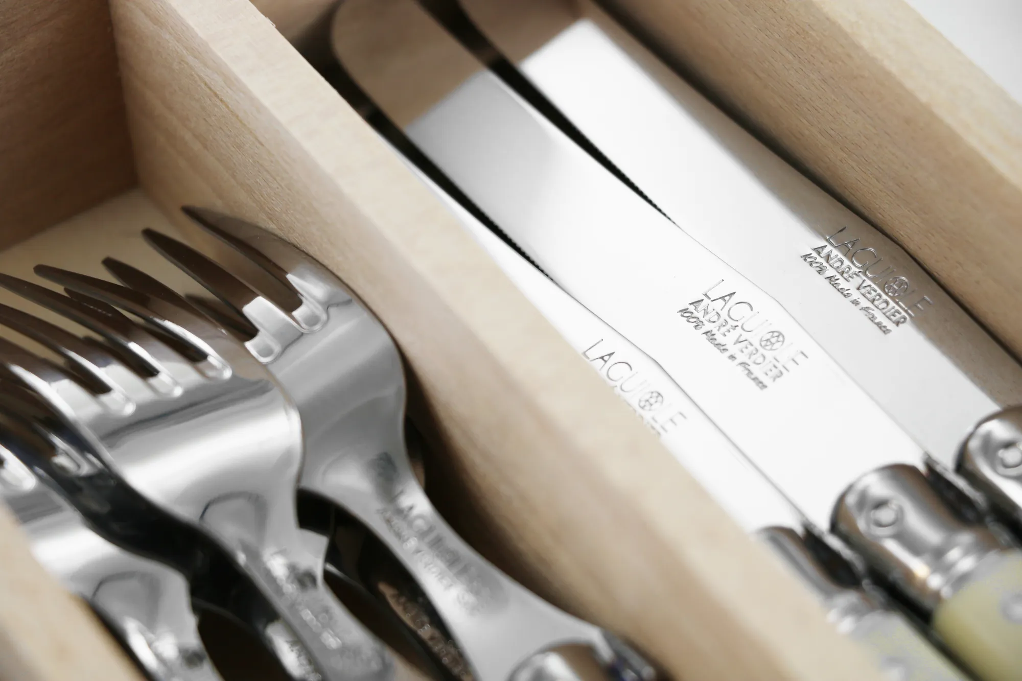 The Andre Verdier 12 Piece Cutlery Set includes 6 knives, 6 table forks. Designed and manufactured by master cutlers in France, Andre Verdier is perfectly balanced and extremely durable, ensuring that this cutlery set will last. Tested and tried in many kitchens they cut smoothly and are razor sharp. Neatly presented in a wooden box that is made from beechwood for convenient storage in your cutlery drawer. The blades are made from high-quality stainless steel and is trademarked with a bee logo on the handle and completed with a beautiful mirror finish.