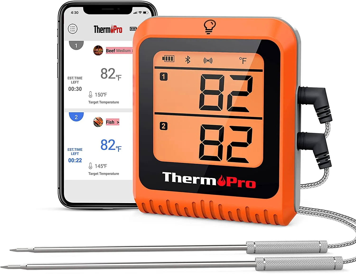 - 150M wireless remote range - with 2.4GHZ wireless Bluetooth-compatible, food temperature and timer can be monitored by ThermoPro phone App within 150 meters.