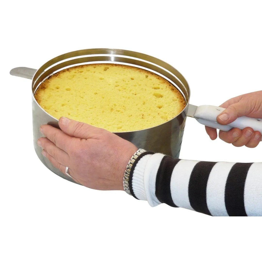 Made from stainless steel with high-quality non-stick coating, this cake cutting aid is perfect for cutting cakes into layers. Place it around the cooled cake, chooses the thickness, and slice with a serrated bread knife, creating even layers ready for icing.